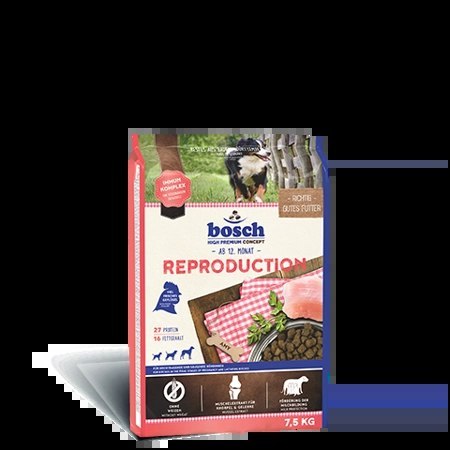 BOSCH Reproduction, to karma stworzona specjalnie z myślą o sukach w oraz po ciąży a także w okresie laktacji. W brzuchu matki dostarczane są im wszelkie niezbędne dla prawidłowego rozwoju składniki odżywcze. Podając więc suczce karmę BOSCH Reproduction zapewniasz długotrwałe zdrowie jednocześnie samicy i jej potomstwu.  Wyjątkowa formuła wraz ze starannie wyselekcjonowanymi składnikami gwarantuje zdrowie matki w okresie ciąży oraz prawidłowy rozwój płodu. Zbilansowana receptura zapewnia wytwarzanie wartościowego mleka przez samicę, które będzie gwarancją doskonałego samopoczucia szczeniaka.