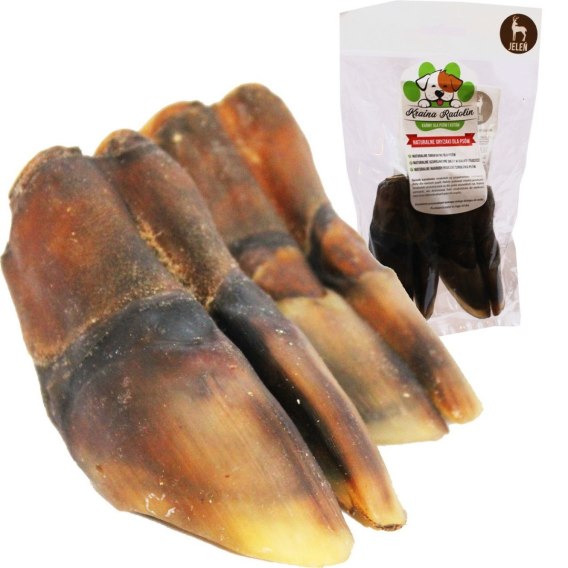 Kopyto jelenia to jeden z najtwardszych naturalnych gryzaków, szczególnie polecany dla średnich i dużych psów. Kopyto jelenia jest bardzo wartościowym gryzakiem dla psa, ponieważ składa się z suszonej skóry, chrząstek oraz kopyta. Dostarcza ono psu wartościowe białko i kolagen, które wzmacniają jego stawy i układ szkieletowy, dlatego jest znakomitym urozmaiceniem codziennej diety. Ponadto gryzak ten może być bezpiecznie podawany psom alergikom, a jego lekkostrawne i niskotłuszczowe cechy sprawdzą się również u psów wrażliwych lub z nadwagą. Gryzak zapewni psu dużo przyjemności z długiego gryzienia i żucia, a przy tym oczyści zęby psa z kamienia i wzmocni jego dziąsła i mięśnie żuchwy. Sprawdzi się u psów energicznych, jako gryzak do rozładowania energii, a także zadowoli psa pozostawionego samego w domu przez dłuższy czas.