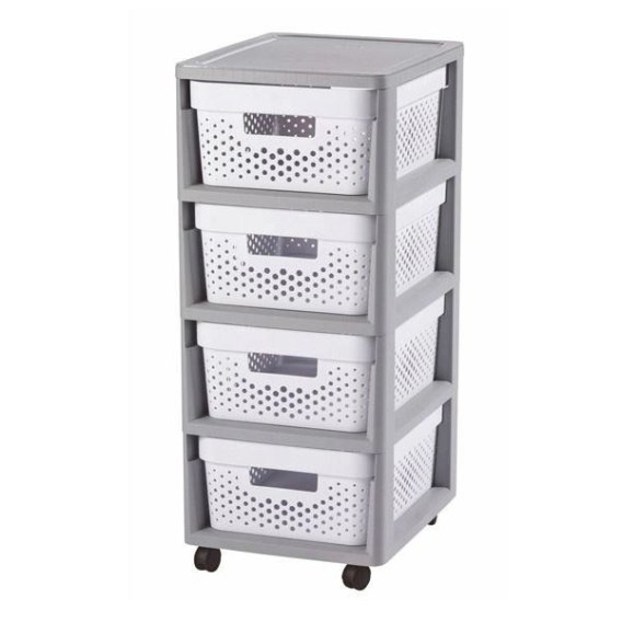 Ażurowy regał do przechowywania z 4 szufladami w kolorze biało-szarym o pojemności 11l każda.