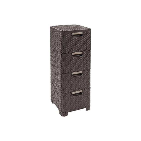 REGAŁ RATTAN STYLE z 4 szufladami CURVER w kolorze ciemny brąz. Stylowy regał ułatwiający organizację akcesoriów. Dzięki oryginalnemu designowi regał znajdzie zastosowanie w kuchni, łazience, sypialni czy garderobie. Regał RATTAN STYLE CURVER przypomina mebel rattanowy, ale jest od niego znacznie lżejszy ale jednocześnie nie traci na swoim wyglądzie.