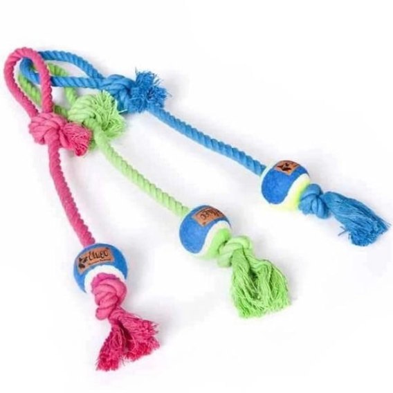 Zabawka dla psa wykonana z wysokiej jakości sznura bawełnianego oraz z piłki tenisowej. Kolor wysyłany losowo.