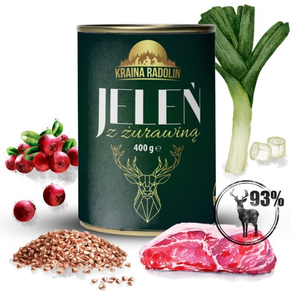 Kraina Radolin Jeleń i żurawina 93% mięsa dla psów z nadwrażliwością pokarmową i alergią puszka karma mokra DZICZYZNA