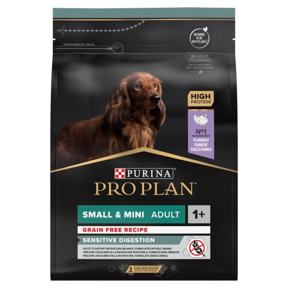 PRO PLAN Sensitive Digestion Small & Mini Adult to specjalistyczna karma dla dorosłych psów małych ras, opracowana z myślą o psach z wrażliwym układem pokarmowym. Dzięki bezzbożowej recepturze, zamiast zbóż zastosowano maniok, który wspomaga trawienie i zapewnia dłuższe uczucie sytości. Indyk, będący pierwszym składnikiem, dostarcza wysokiej jakości białka, które wspiera utrzymanie silnych mięśni i idealnej kondycji ciała. Karma zawiera prebiotyki, które poprawiają równowagę mikrobiomu jelit, a także składniki wspierające zdrowie jelit i poprawiające jakość stolca.