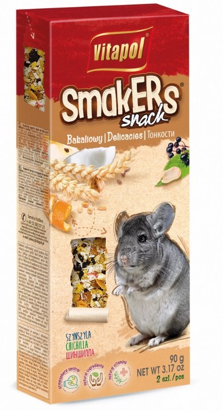 Smakers stanowi urozmaicenie i uzupełnienie diety szynszyli. To mieszanka orzechów z jabłkiem, czarnym bzem oraz skórką pomarańczową. Orzechy uzupełniają dietę w witaminę E, która działa ochronnie na układ nerwowy i układ odpornościowy, jest doskonałym przeciwutleniaczem. Poza tym są bogatym źródłem magnezu oraz witaminy B i B1, a zawarte w nim tłuszcze to głównie korzystne dla zdrowia nienasycone kwasy tłuszczowe. Owoce czarnego bzu są źródłem witaminy A, B1, B2, C oraz karotenoidów i jodu, pektyn, garbników, soli mineralnych oraz olejków eterycznych. W 80% wykonywane ręcznie.