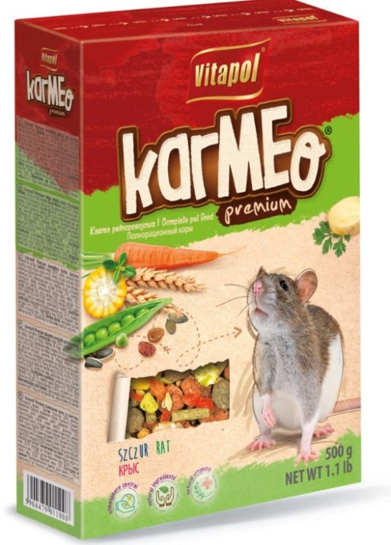 Mieszanka pełnoporcjowa dla szczurów, odpowiednio zbilansowana, w której skład wchodzą podstawowe składniki diety gryzoni w naturalnym środowisku. Jest to mieszanka najlepszej jakości zbóż i nasion oraz witaminizowanych granulatów wzbogacona warzywami i pokarmem mięsnym, który dostarcza niezbędnego w rozwoju i funkcjonowaniu organizmu szczurów białka zwierzęcego. Marchew z wysoką zawartością beta-karotenu, czyli prowitaminy A, dostarcza ważnych związków mineralnych, takich jak wapń, żelazo, fosfor, miedź, cynk, molibden, magnez, jod oraz potas. Pestki dyni zawierającego dużą ilość fitosteroli i nienasyconych kwasów tłuszczowych oraz łatwo strawne białka, witamina E i mikroelementy jak selen, magnez, cynk, miedź i mangan. Liście mięty zawierają olejek eteryczny, witaminę C oraz A. Dodatek mięty wspomaga trawienie, poprawia apetyt oraz przeciwdziała wzdęciom. Bogaty w związki pozytywnie wpływające na układ immunologiczny. Zapewnia lśniącą sierść oraz zdrowe zęby.