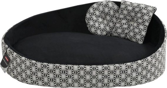 Legowisko dla psa z grubej tkaniny i futerka, o długości 80cm w kolorze czarnym z białym wzorem.